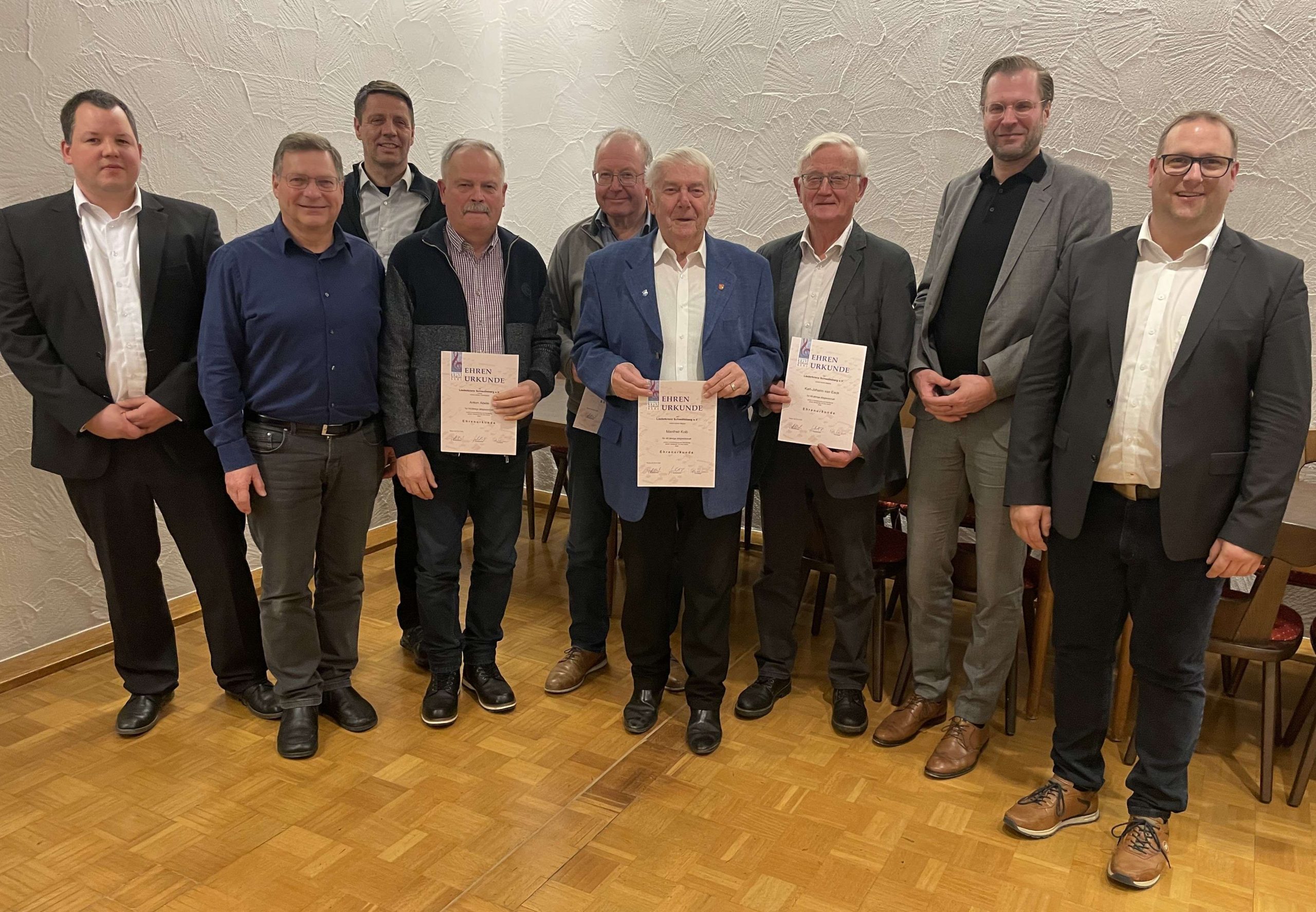 Ehrungen beim Liederkranz Schwabsberg (von links): Zweiter Vorsitzender Daniel Schaffer, Chorleiter Peter Waldenmaier, Klaus Schmid, Anton Abele, Karl Mayer, Manfred Kolb, Karl-Johann van Eeck, Bürgermeister Christoph Konle, Vorsitzender Frank Kroboth