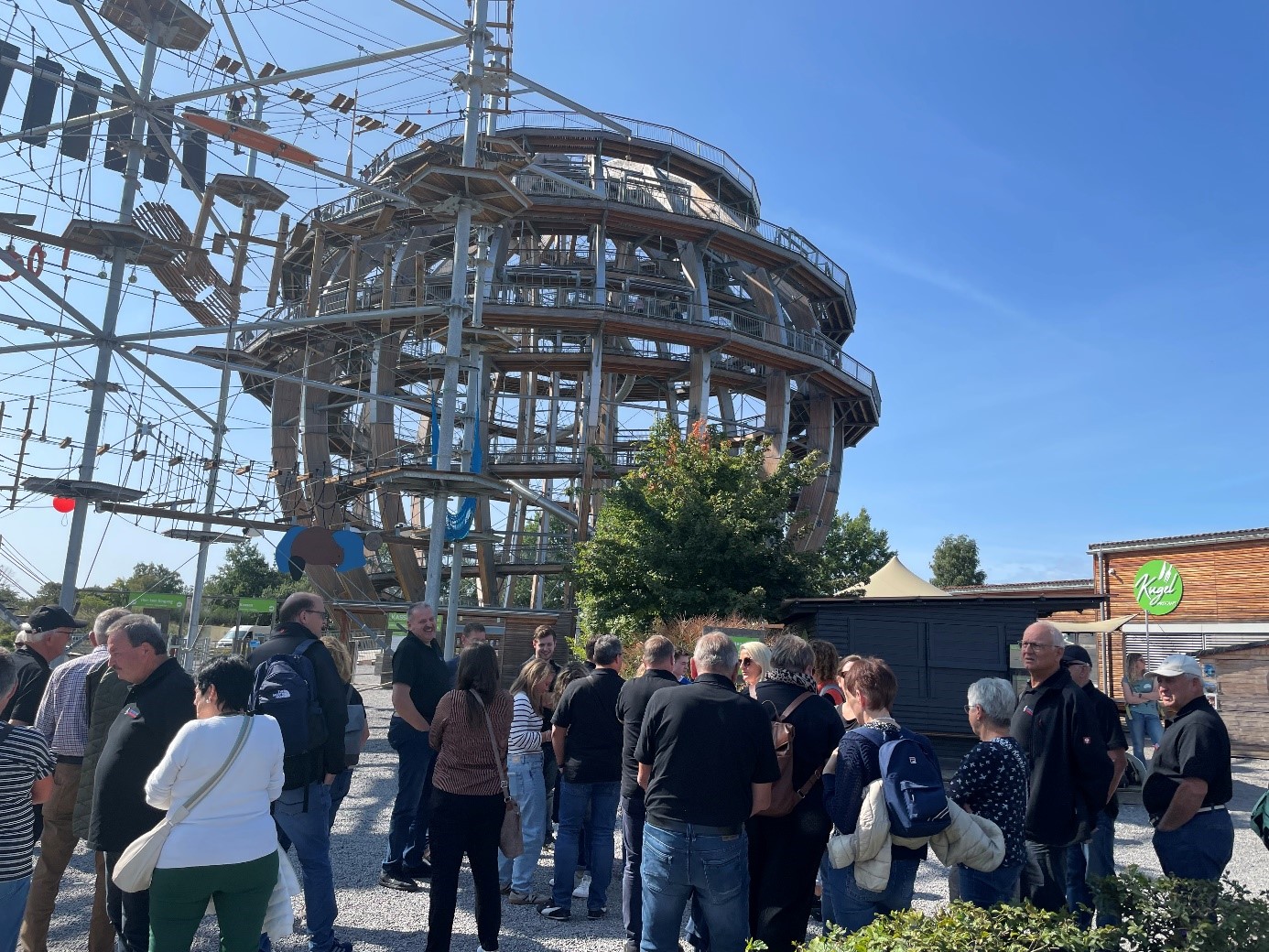 Der Liederkranz Schwabsberg unternahm mit seinen Sängern, Familienangehörigen und Freunden einen Ausflug nach Steinberg am See und nach Amberg. Mit 54 Personen an Bord ging es mit dem Bus bereits früh los. Bei Nürnberg legten wir bei strahlendem Sonnenschein eine kurze Frühstückspause ein. In Windeseile wurde zur Stärkung ein kleines Buffet gezaubert mit Kaffee, Sekt-Orange und kleinen Snacks. Erste Station war die größte begehbare Holzkugel der Welt am Steinberger See. Auf der Aussichtsplattform stimmten wir unter dem Dirigat unseres Chorleiters Peter Waldenmaier „Von fern klingt leise eine Melodie“ und „Musik erfüllt die Welt“ an und blickten aus 50 Metern Höhe auf die Oberpfälzer Seenlandschaft hinab. Wer sich traute konnte auch die Rutsche nach unten nehmen, was einige gerne mehrfach wiederholten.